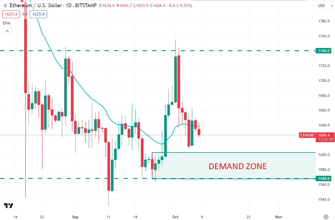ETH 价格未能突破 1740.0 美元的心理事件水平,目前在 1625.3 美元的价格区域附近交易。 从 1568.0 美元价格区域反弹后,多头重新获得动力并将价格推高,但未能将看涨势头维持在 1740.0 美元阻力位上方。 根据当前的价格走势,价格可能会回落至需求区域。 因此,如果价格回撤至需求区域,并且日线看涨蜡烛收于其上方,多头可能会在未来几天再次将价格推向 1740.0 美元的价格区域。