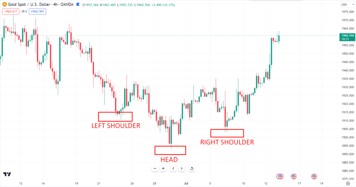 - 交易策略:交易者识别该形态并等待突破颈线1,934.90美元作为确认。他们建立多头头寸,止损单位于右肩下方。目标是根据形态的高度设定的,例如1,976美元。