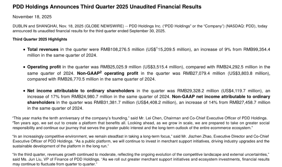 ▲ PDD Holdings Q3 2025财报亮点(原文第1页)(来源:PDD Holdings Q3 2025财报原文)