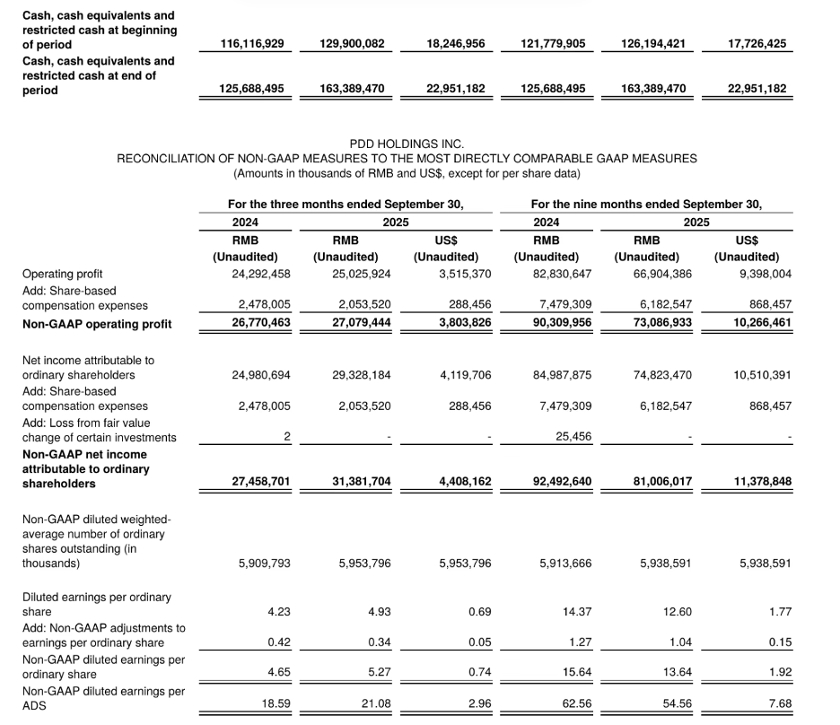 ▲ Non-GAAP调节表(原文第6页)(来源:PDD Holdings Q3 2025财报原文)