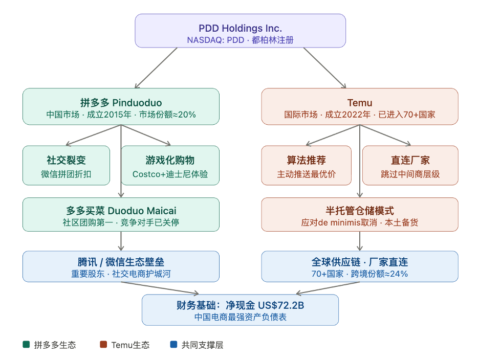 PDD Holdings旗下运营两大核心平台:面向中国市场的拼多多和面向国际市场的Temu。两者均以极致低价切入竞争充分的成熟市场,复制了相近的增长逻辑,却各自面临截然不同的监管与竞争格局。