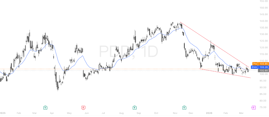 自2025年11月高点约$140附近见顶后,股价形成清晰的下降楔形(Descending Wedge)形态——上轨压力线从$140附近持续下压,下轨支撑线从$100一带斜向上收敛,当前价格约$103处于楔形末端。从形态学角度,下降楔形属于潜在的看涨反转信号,有效向上突破上轨则确认形态成立;若破下轨,则有加速下探至$95乃至$90支撑区的风险。