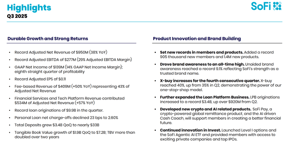According to the Q3 2025 investor report, SoFi’s financial performance shows simultaneous improvement in earnings quality alongside rapid growth.