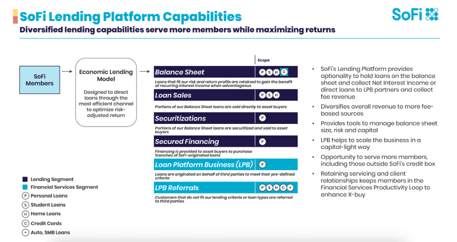 - SoFi does not hold the loans itself; it provides underwriting, pricing, and risk management for third-party institutions.