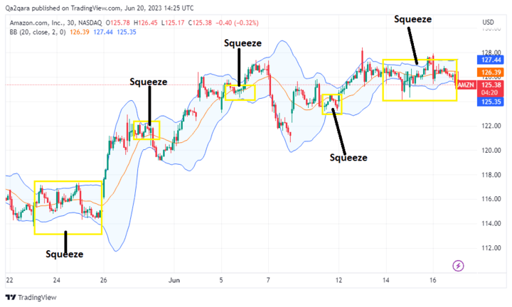 你可以使用布林線來識別亞馬遜股票的突破以獲得交易機會。突破是指股價經過一段時間的盤整後大幅上漲或下跌。布林線為交易者提供了一種監控突破的直觀方式。
