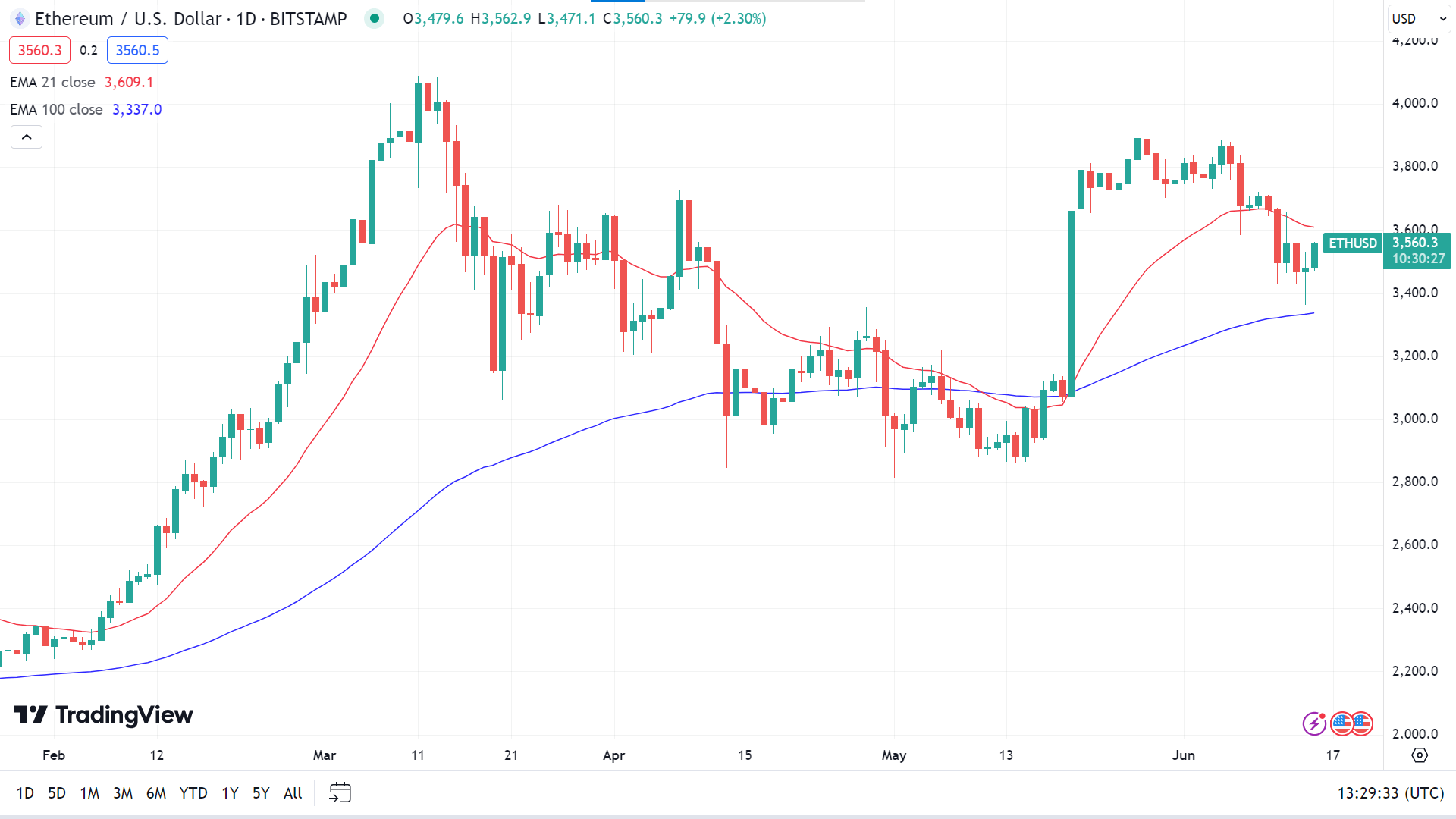 以太坊交易價格接近 3,560 美元,過去 24 小時內上漲 0.6%。過去一周,以太坊下跌了 4%,但在過去 30 天內上漲了 22%。
